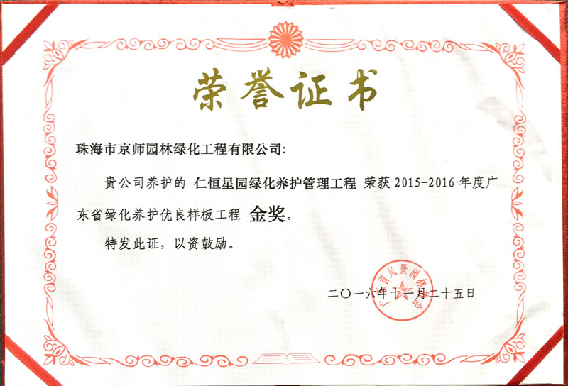 2015-2016年度广东省景物园林优良样板工程获奖证书如下: